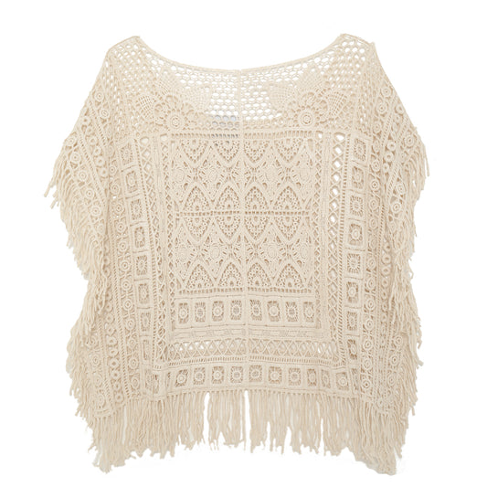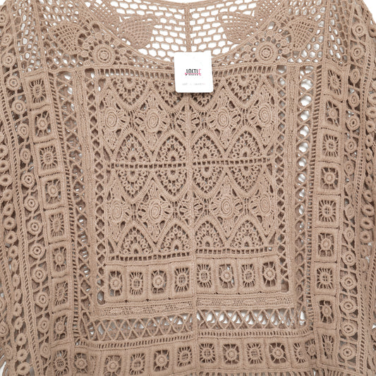 Haut en dentelle crochetée style bohème chic avec pompons couleur terre d'ombre